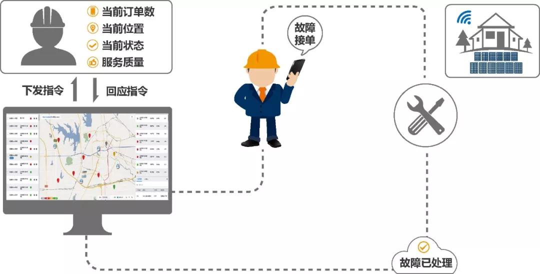 運維方面,從成本角度考慮,村級扶貧電站不適合派人長期駐守運維,故障的及時發(fā)現(xiàn)、分析、解決需要制定靈活高效的運維方案。光伏行業(yè)先進企業(yè)通過現(xiàn)代化物聯(lián)網(wǎng)技術(shù)、人工智能及大數(shù)據(jù)分析技術(shù),為光伏電站打造智慧大腦,實現(xiàn)電站實時監(jiān)測、智能分析和診斷、快速定位。此次示例設(shè)計方案中將電站接入智慧能源扶貧平臺,在實現(xiàn)以上功能基礎(chǔ)之外,增加智能派單功能,實現(xiàn)及時消缺,使得村級扶貧電站的運維更加高效。