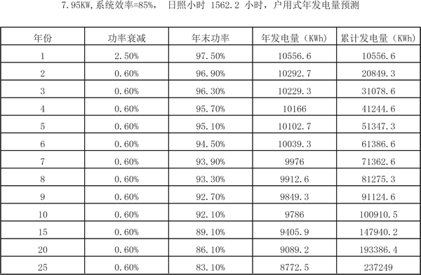 我們以山東濟(jì)南一戶安裝了30塊265Wp的高效組件,裝機(jī)容量共7.95KW,系統(tǒng)效率=85%,按照8元/w的系統(tǒng)價(jià)格計(jì)算,需要用戶投入資金約63600元。項(xiàng)目安裝地濟(jì)南地區(qū)全年日平均有效發(fā)電日照時(shí)數(shù)為4.28*365=1562.2小時(shí)(山東屬于日照條件比較好的地區(qū),可以達(dá)到1500小時(shí),全國的平均水平約為1300小時(shí)左右)。假設(shè)組件首年衰減2.5%,之后每年衰減0.6%。可以算出一個(gè)8KW系統(tǒng),使用一臺8KW單相機(jī)逆變器,20年累計(jì)發(fā)電量約為20萬度,25年的累計(jì)發(fā)電量約23.7萬度。