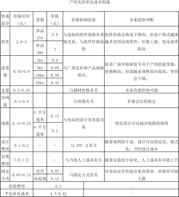 由于光伏材料的價(jià)格變化比較快,5-6.5元的每瓦成本僅作為市場參考值,由于廠家和經(jīng)銷商還要在當(dāng)中環(huán)節(jié)獲利,假設(shè)廠商每瓦獲利0.5-1元,經(jīng)銷商每瓦獲利1-1.5元,那么到消費(fèi)的價(jià)格大致是6.5-9元。與現(xiàn)在市場行情基本相符。從各個(gè)環(huán)節(jié)的價(jià)格影響因素和未來趨勢判斷,我們可以看到未來戶用式光伏單瓦價(jià)格不一定會下降,但是發(fā)電效率和安全性是一定會提高的。戶用光伏作為直接面向消費(fèi)者的產(chǎn)品,具有投資品和消費(fèi)品的雙重屬性,因此市場價(jià)格必然會有較大差異,產(chǎn)品差異性也會長期存在。但是有一點(diǎn)必須提出,戶用式光伏由于較高的單位成本,短期內(nèi)還是需要依靠補(bǔ)貼來保證收益率。
