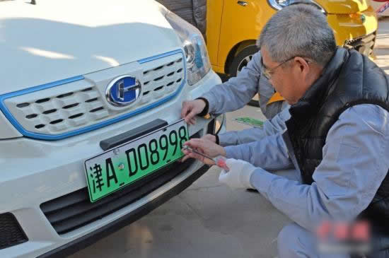 資料圖:天津市交管部門發出了天津首張綠色、六位號碼的新能源汽車專用號牌。中新社記者 佟郁 攝