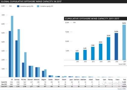 全球海上風(fēng)電雨后春筍般蓬勃發(fā)展,熱度不減。2017年全球新增裝機(jī)量為4334MW,累積裝機(jī)量為18814MW。那么,各國(guó)發(fā)展情況如何呢?WindDaily用全球風(fēng)能理事會(huì)權(quán)威數(shù)據(jù)為您呈現(xiàn)。