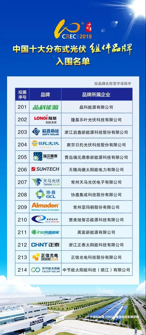 本次評選活動共設“中國十大分布式光伏系統品牌”、“中國十大分布式光伏組件品牌”、“中國十大分布式光伏逆變器品牌”三大獎項,入圍品牌后續將通過網絡投票、專家評審和客戶打分三個環節最終產生獲獎名單,評選結果將于今年11月1-3日在無錫舉辦的“第十屆中國(無錫)國際新能源大會暨展覽會”的頒獎典禮上揭曉。