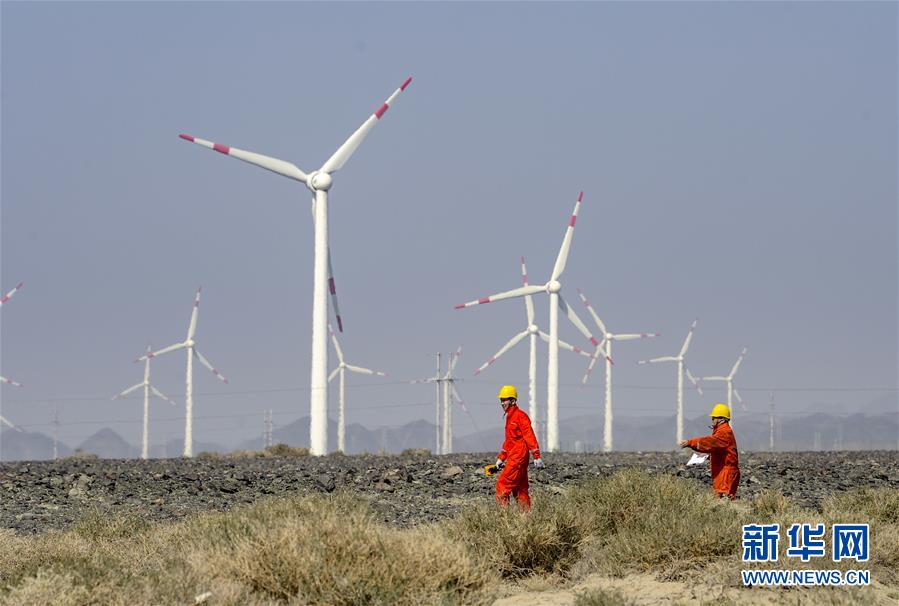 在烏魯木齊近郊的達坂城風力發電場,兩位工作人員在巡檢風力發電設備(9月18日攝)。