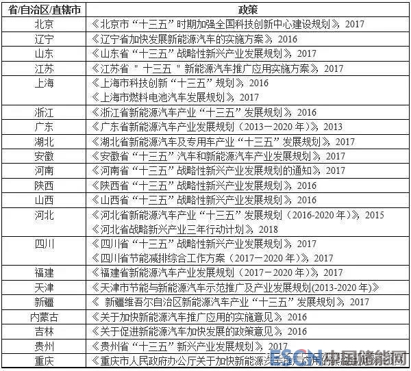 早在2001年,科技部發布的“國家“863”計劃重大專項”就將燃料電池汽車研究開發列入其中;到了近些年,緊密出臺的《節能與新能源汽車產業發展規劃(2012—2020年)》、《中國制造2025》、《能源技術革命創新行動計劃(2016-2030年)》、《國家創新驅動發展戰略綱要》、《“十三五”國家戰略性新興產業發展規劃》以及《汽車產業中長期發展規劃》等文件,均明確提及要重點研發氫能與燃料電池技術,表現出中央政府對該新型能源技術的大力支持。此外,多個省/自治區/直轄市也積極布局燃料電池產業,形成了巨大的引領效應(統計如下表)。