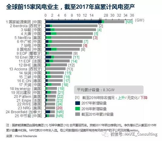 Wood Mackenzie電力與可再生能源事業(yè)部(以下簡稱WoodMac)近期發(fā)布《2018年全球風電資產(chǎn)所有權(quán)報告》。報告顯示,根據(jù)截至2017年底累計風電裝機容量排名的全球前25家風電業(yè)主中,11家持有風電資產(chǎn)的中國業(yè)主躋身榜單,其中由國電集團與神華集團合并重組后的國家能源集團以34GW累積風電資產(chǎn)傲居榜首。