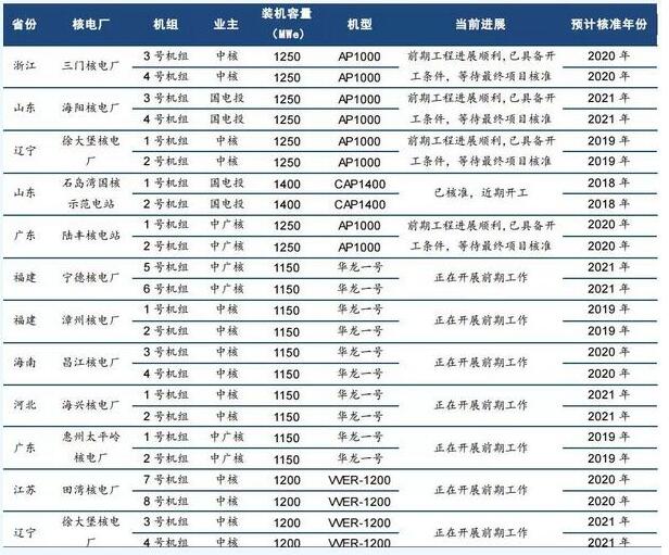 核電建設(shè)屬于電力投資,在經(jīng)濟(jì)面臨下行壓力時(shí),會(huì)發(fā)揮逆周期屬性。通過高國產(chǎn)化率機(jī)組建設(shè),拉動(dòng)國內(nèi)高端制造產(chǎn)能。隨著CAP1400示范電站項(xiàng)目核準(zhǔn),核電新項(xiàng)目正式重啟,自主三代核電技術(shù)“華龍一號(hào)”將是后續(xù)新開工機(jī)組的主要選項(xiàng)。目前國內(nèi)條件較為成熟的“華龍一號(hào)”儲(chǔ)備機(jī)組有10臺(tái),將在未來3年內(nèi)陸續(xù)實(shí)現(xiàn)開工。