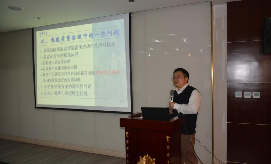 會議伊始,由清華大學柔性輸配電系統研究所所長姜齊榮老師現場致辭,并作《電能質量治理現狀及電能質量新進展》的報告,姜老師對電能質量治理現狀、電能質量治理中存在的哪些問題進行全面的解析與精彩發言,強調了配網動態電壓過程中的穩定性及操作性,不平衡補償方案的適應性及解決方案,保證產品在各種環境下適應能力和安全性。最后他特別提醒,電能質量問題要引起高度重視,要正確解決電能質量補償裝置引起的震蕩問題,降低損耗與噪音,綜合電能質量治理裝置是未來的發展方向。