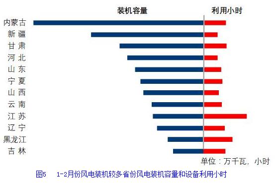分類型看,1-2月份,全國水電設(shè)備平均利用小時為433小時,比上年同期增加23小時。在水電裝機容量超過1000萬千瓦的8個省份中,湖南、貴州、青海、云南、廣東和廣西同比分別增加212、64、56、52、29和20小時,四川和湖北同比分別降低33和30小時;全國火電設(shè)備平均利用小時為730小時(其中,燃煤發(fā)電和燃氣發(fā)電設(shè)備平均利用小時分別為757和397小時),比上年同期增加1小時。分省份看,全國共有14個省份火電設(shè)備利用小時超過全國平均水平,其中甘肅超過900小時,湖北、青海、河北、安徽、陜西、新疆、內(nèi)蒙古、江西和北京超過800小時,而云南和西藏僅為205和55小時。與上年同期相比,共有15個省份火電利用小時同比增加,其中四川增加155小時,新疆、甘肅、湖北和北京增加超過100小時,而廣東和海南下降超過100小時,分別降低112和100小時。全國核電設(shè)備平均利用小時1040小時,比上年同期降低53小時;全國并網(wǎng)風(fēng)電設(shè)備平均利用小時351小時,比上年同期降低36小時;全國太陽能發(fā)電設(shè)備平均利用小時164小時。