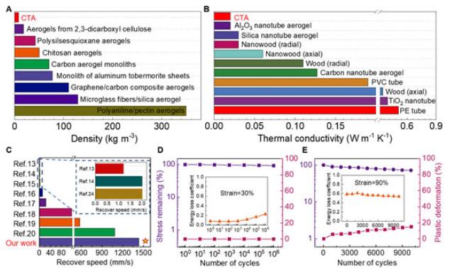 圖2.CTA的性能表征。(A)不同材料密度的對比;(B)不同材料熱導率的對比;(C)不同材料回復速度的對比;(D)CTA在壓縮形變為30%的條件下,壓縮一百萬次的機械性能變化;(D)CTA在壓縮形變為90%的條件下,壓縮一萬次的機械性能變化。