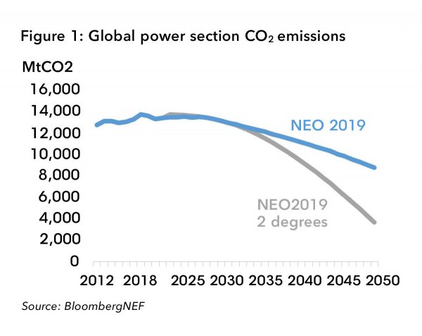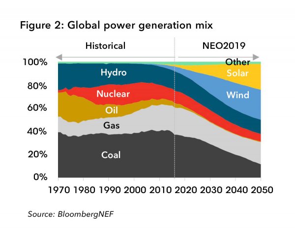 根據彭博新能源財經(BNEF)的最新預測,到2050年,風能、太陽能和電池技術成本的大幅下降,將導致電網由這兩種快速增長的可再生能源提供近一半的電力。在《2019年新能源展望》(NEO)中,BNEF認為這些技術將確保——至少到2030年——電力行業為防止全球氣溫上升超過2攝氏度做出自己的貢獻。[1]