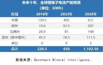 根據數據研究機構Benchmark Mineral Intelligence預測,未來十年,全球鋰電池產能將增加399%,并進入1TWh時代。其中,中國將成為全球鋰電池產業的重鎮,2028年,中國的鋰電池產能將達到631GWh,占全球的57.2%。