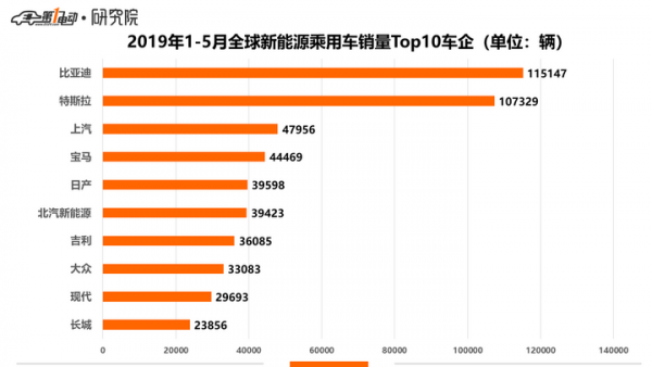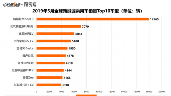 特斯拉Model 3依然傲冠群雄,5月當月和2019年1-5月累計銷量排名均遙遙領先。