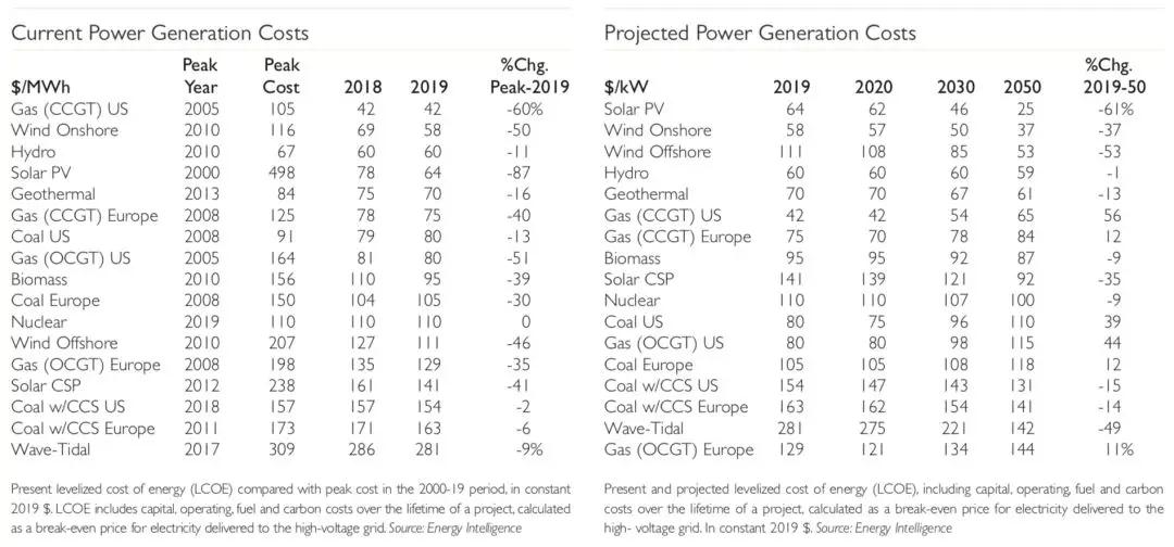 根據Energy Intelligence雜志匯總的數據,2000年以后全球各類發電技術平均成本的峰值、2019年成本以及2050年預測成本如下: