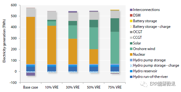 信用值明顯低于常規火力發電廠,因此生產相同數量的電力需要大量提高容量。相同條件下,在沒有安裝VRE的基本情況下容量為98GW,而部署VRE達到10%和30%的滲透水平后,系統的總容量分別增加到118GW和167GW。如果VRE裝機容量達到50%,則總裝機容量將增加一倍以上,達到220GW。如果全部電力需求的75%由VRE發電提供,則容量將超過325GW,即超過峰值需求的三倍。換句話說,由于VRE的滲透增加了巨大容量,因此需要投資來滿足對應的需求。上圖ES3顯示了五種主要場景中不同發電技術的容量組合,上圖ES4顯示了它們各自的發電份額。