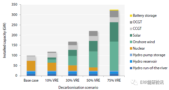 風能和光伏發電占比10%的系統成本為,每MWh的成本低于10美元,風能和光伏發電占比75%的系統成本為,每MWh的成本超過50美元。