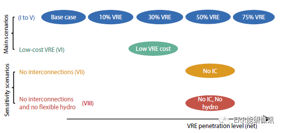本研究旨在評估替代性低碳電力系統的成本,該系統能夠實現嚴格符合《巴黎協定》的碳減排目標。因此本文比較了具有代表性的經濟合作及發展組織國家的電力部門6種不同場景的總成本,這些情景均符合50g/kW的低碳約束,但其核能和可再生能源占比不同,特別是風能和太陽能光伏(PV)。這些份額占總用電量的0~75%。本文通過假設未來顯著降低VRE的成本,完成了對低間歇性可再生能源(VRE)投資成本的場景分析。本文圍繞不同級別的可用靈活性資源(互連的可用性或靈活的水電資源)構建的兩個敏感性完成了一套共8個場景的分析,可以很好地理解脫碳成本的主要驅動因素(參見下面的圖ES1)。研究特別強調了風能和太陽能光伏生產的間歇性對電力系統成本的影響,反應對其系統成本深刻影響。