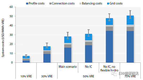 風能和光伏發電占比50%的系統成本為,每MWh的成本為50美元。成本的變化是與鄰國水電資源的靈活度相關。雖然這種估計有一定程度的不確定性,但其數量級為政策選擇提供了明確的指示。