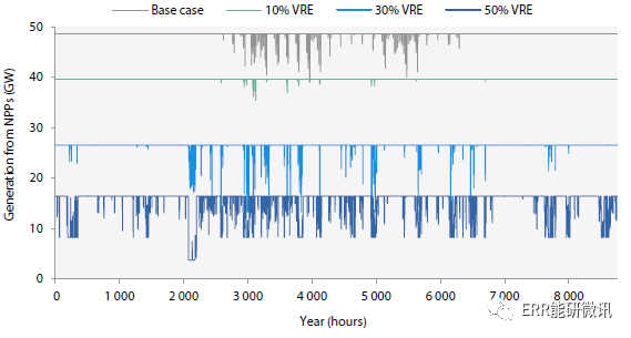核電裝機容量隨著可再生能源的比重上升而逐步下降。在成本最低且無VRE的情況下,核電是低碳電力的主要來源,約占總電力需求的75%,且核電對靈活性的需求極小。在總費用較高的情況下,對核能靈活性的需求逐步增加。在VRE占比50%的情況下,核電機組最多可增減其裝機容量的30~35%。