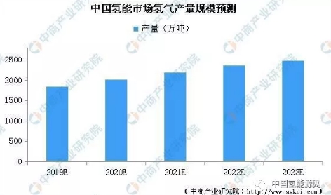 隨著我國氫能產業加速發展,氫能的應用越來越廣泛。在此背景下,氫氣產量持續增長。據預測,2019年我國氫氣產量將近2000萬噸,到2020年將超2000萬噸。