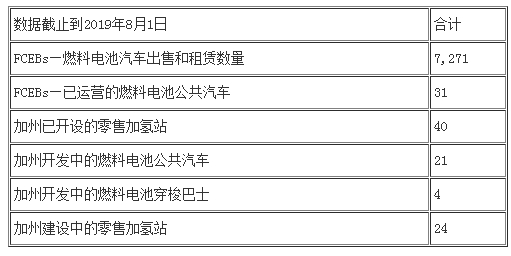 該表顯示了有多少燃料電池汽車已售出和出租,有多少燃料電池公共汽車在路上行駛,以及加州有多少加氫站在運營。