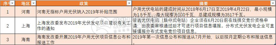 “沉睡多時”的戶用光伏市場,7月逐漸回暖。河北、河南分別調整了戶用光伏補貼范圍及明確了戶用光伏納入2019年補貼范圍,而海南戶用光伏市場明確了報送流程及報送時間。同時,上海地區戶用光伏項目也在緊鑼密鼓的籌備中。