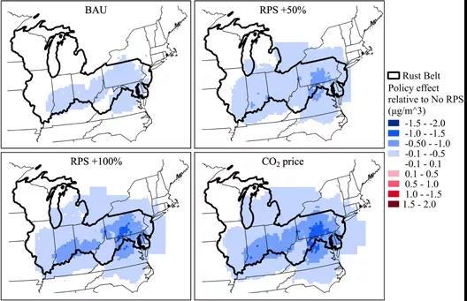為什么會有這么大的回報?除了導致地球變暖的的溫室氣體之外,非清潔能源也會影響空氣質量。科學家量化的健康益處是限制接觸來自發電廠的細顆粒物質的結果。并且有大量證據表明顆粒物或煙灰如何對呼吸和心血管健康產生不利影響。研究人員將研究重點放在賓夕法尼亞州、俄亥俄州、威斯康星州、密歇根州、伊利諾伊州、印第安納州、西弗吉尼亞州、新澤西州、馬里蘭州和特拉華州的原因之一是因為該地區的空氣質量往往較差,這主要是這些地區更加依賴于煤炭等傳統能源。2016年,煤炭發電占鐵銹地帶(Rust Belt)電力構成的42%。