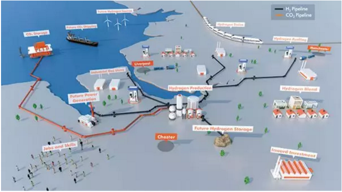 Hydeploy項目示意圖:黑色管線為氫氣運輸管道,中間交匯處為制氫廠,橙色管線用于制氫過程中的二氧化碳捕捉