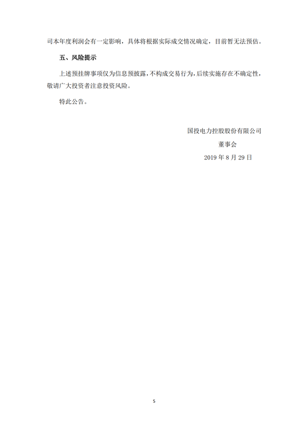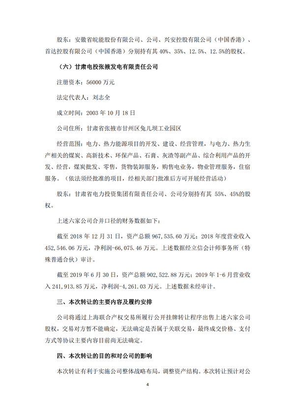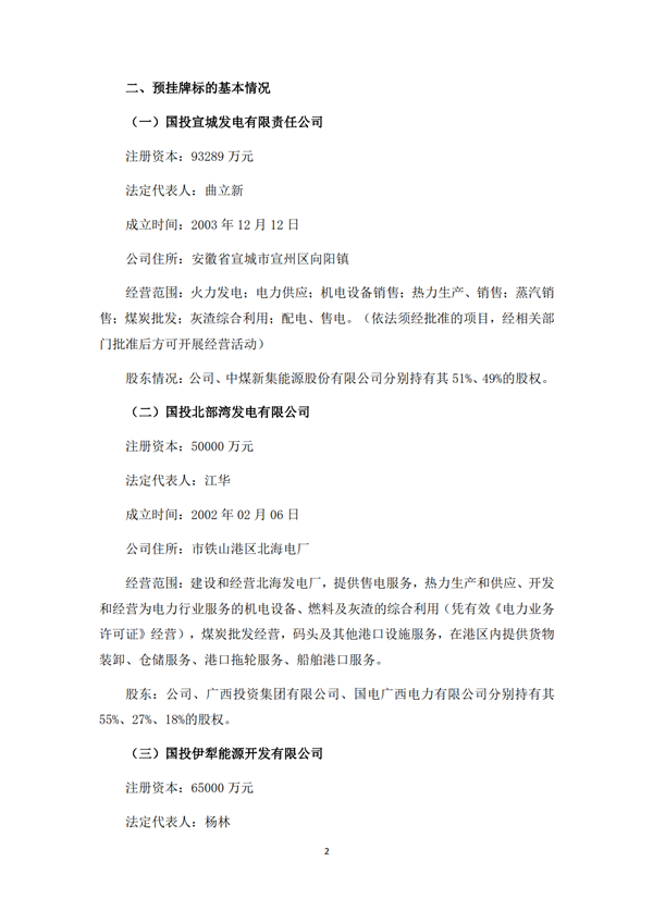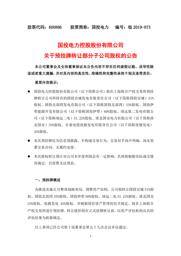 國投電力控股股份有限公司(以下簡稱公司)擬在上海聯合產權交易所預掛牌轉讓公司所持有的國投宣城發電有限責任公司(以下簡稱國投宣城)51%股權、國投北部灣發電有限公司(以下簡稱國投北部灣)55%股權、國投伊犁能源開發有限公司(以下簡稱國投伊犁)60%股權、靖遠第二發電有限公司(以下簡稱靖遠二電)51.22%股權、淮北國安電力有限公司(以下簡稱淮北國安)35%股權、甘肅電投張掖發電有限責任公司(以下簡稱張掖發電)45%股權。