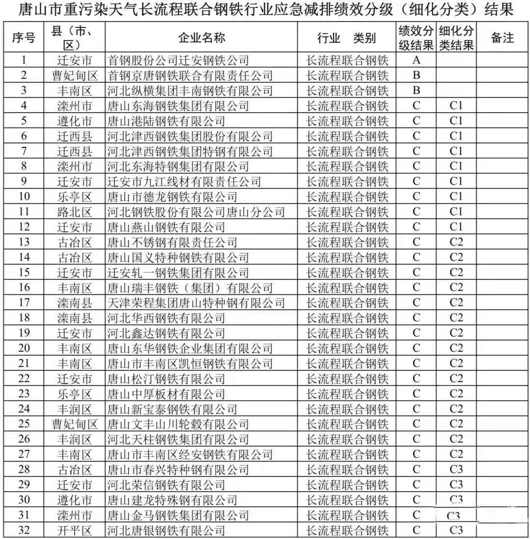 10月9日,唐山市人民政府印發(fā)了《10月份全市大氣污染防治強(qiáng)化管控方案》。該方案顯示,本次管控時(shí)限為2019年10月10日0時(shí)至10月31日24時(shí)。對(duì)鋼鐵行業(yè)(含高爐鑄造),績(jī)效評(píng)價(jià)為A、B類的不限產(chǎn)(注:A類企業(yè)僅1家,B類企業(yè)為2家,其余皆為C類),績(jī)效評(píng)價(jià)為C類的燒結(jié)、球團(tuán)裝備、石灰窯、高爐停產(chǎn)50%(含)以上,以生產(chǎn)裝備計(jì),具體停產(chǎn)裝備要求參照新修訂的《重污染天氣應(yīng)急工業(yè)源污染物減排清單》“鋼鐵企業(yè)第一階段減排措施”執(zhí)行。