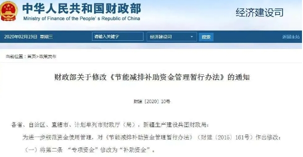 財(cái)政部修改《節(jié)能減排補(bǔ)助資金管理暫行辦法》