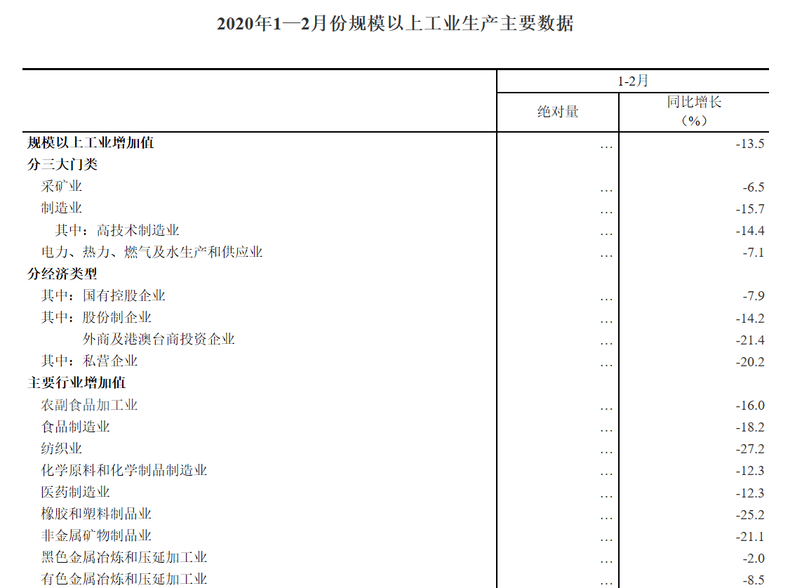 統計局最新發布數據顯示,1—2月份,規模以上工業增加值同比實際下降13.5%(以下增加值增速均為扣除價格因素的實際增長率)。從環比看,2月份,規模以上工業增加值比上月下降26.63%。