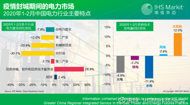 埃信華邁(IHS Markit)通過研究中國電力聯合會發布的數據顯示,1-2月份,中國全社會用電量同比下降7.8%,降幅之大甚至超過了2008-2009年全球金融危機期間。