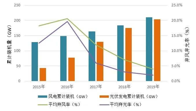 圖1 2015-2019年風、光累計裝機量及棄風、棄光率