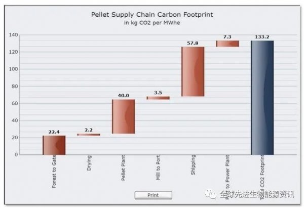 對于卡車、鐵路或輪船的行駛距離,每噸公里使用的燃料、發(fā)電方式和英國電站使用顆粒的效率等進行多個假設(shè),以將顆粒從美國東南部運送到英國發(fā)電廠 ,估計的二氧化碳足跡為每兆瓦時發(fā)電量(kg / MWhe)約133公斤。上表顯示了如何計算*。將煤運到發(fā)電站將具有相似的二氧化碳足跡。
