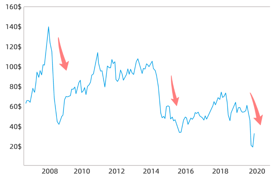 2008~2020年,WTI原油價(jià)格經(jīng)歷了3次斷崖式下跌