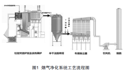 煙氣凈化系統(tǒng)主要針對(duì)酸性氣體(HCl、HF、SOx、NOx)、二噁英、重金屬及顆粒物等進(jìn)行控制,其工藝設(shè)備主要由四部分組成:即NOx的去除、除NOx外的其他酸性氣體(以下簡稱為酸性氣體)脫除、二噁英的去除和顆粒物捕集,其中NOx的去除在鍋爐部位進(jìn)行,其他在煙氣治理部分。另外,煙氣中有機(jī)物、重金屬等污染物在以上工藝治理過程中同時(shí)加以捕集。該項(xiàng)目煙氣凈化系統(tǒng)采用目前最成熟的半干式煙氣處理系統(tǒng),工藝流程為:SNCR脫硝+半干法脫酸+消石灰干粉噴射+活性炭噴射裝置+布袋除塵器。煙氣凈化系統(tǒng)工藝流程見圖1。