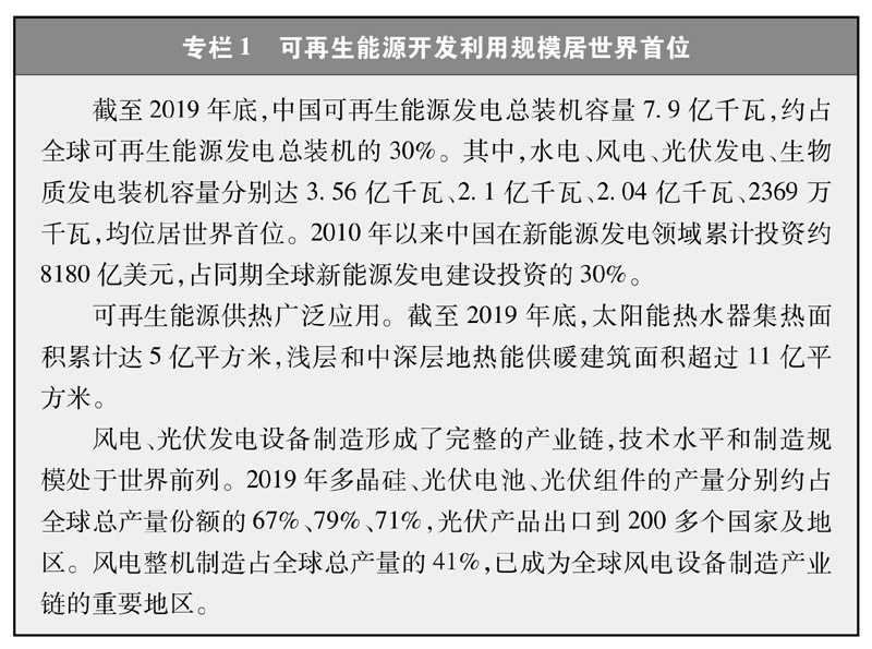中國堅定不移推進能源革命,能源生產和利用方式發生重大變革,能源發展取得歷史性成就。能源生產和消費結構不斷優化,能源利用效率顯著提高,生產生活用能條件明顯改善,能源安全保障能力持續增強,為服務經濟高質量發展、打贏脫貧攻堅戰和全面建成小康社會提供了重要支撐。