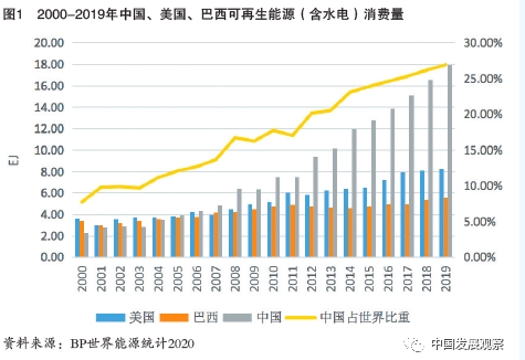 2019年,我國可再生能源(含水電)消費總量達到17.95EJ(1EJ (艾焦)是10的18次方J。1千焦等于34毫克標準煤),與2000年相比,我國可再生能源(包括水電) 消費總量增長了6.95倍,而同期一次能源消費總量僅增長2.34倍(文中數據如果不特別注明,均來自《BP世界能源統計2020》——作者注)。自2005年可再生能源(含水電)消費量超過巴西和美國后,我國就成為全球最大的可再生能源(含水電)消費國,同時也是最大的生產國(可再生能源除了生物質能外,太陽能、風能、水能不易儲存,因而消費量與生產量相差不大)。2019年我國占全球可再生能源(含水電)消費量份額高達26.94%。