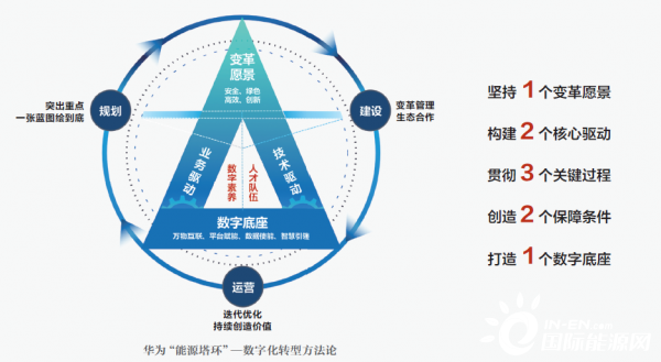 “能源塔環”方法論共包含五大要素:一是堅持 1 個變革愿景,轉型是一把手工程,需要基于定位明確的企業變革愿景;二是構建 2 個核心驅動,分別是業務要素和技術要素,雙輪驅動;三是貫徹 3 個關鍵過程,規劃、建設、運營一體化統籌,要一張藍圖繪到底并重點突破,圍繞解決問題、創造價值,持續建設、迭代運營;四是創造 2 個保障條件,要構建數字化的文化、氛圍、知識、技能,通過人才進行突破,通過團隊和平臺進行固化,形成能力;五是打造 1 個數字底座,按需實現萬物互聯、平臺賦能、數據使能、智慧引領。