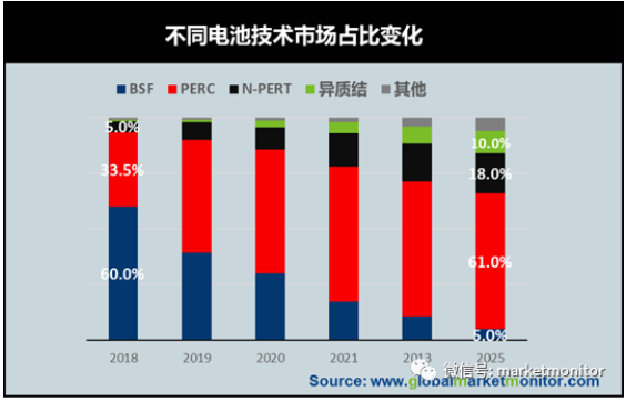 高效單晶市場份額逐漸擴大。隨著光伏市場的不斷發展,高效電池將成為市場主導,單晶硅電池市場份額逐步增大,2019年單晶硅片市場份額超過50%,隨著異質結電池、N型PERT電池的應用推廣,N型單晶硅片的市場份額,也將逐年提高,單晶硅片的市場份額未來將逐步升高。