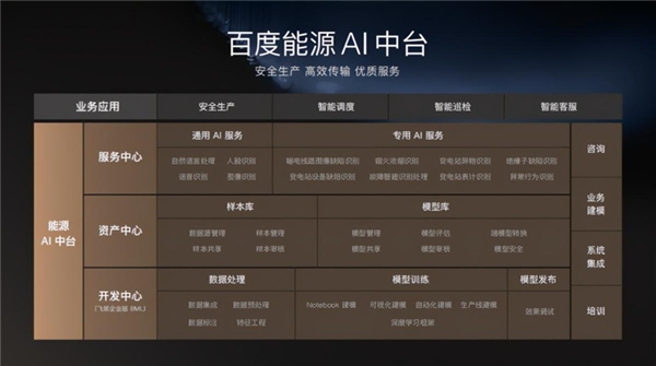 在2020百度世界大會智能云分論壇上,百度智能云能源AI中臺首次正式對外發布。能源AI中臺為能源企業智能化升級提供從方法論、平臺、服務在內的全套工具,幫助能源生產更安全,傳輸更高效,客戶服務更優質?;谀茉碅I中臺解決方案,能源企業可以更快速地實現上層的智能應用,快速搭建“數據+平臺+應用”的新模式,并且具備持續創新、不斷演進的自生能力。