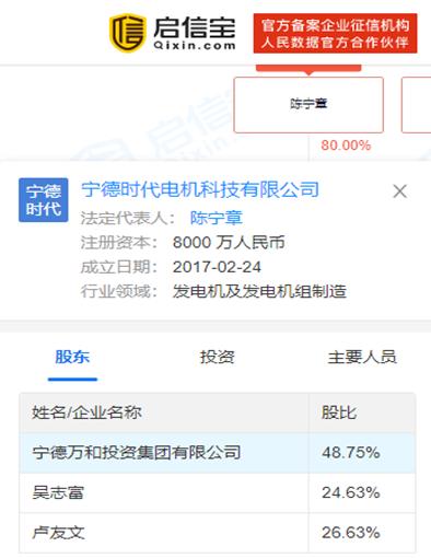 寧德萬和投資集團有限公司(以下簡稱“寧德萬和”)持有該公司48.75%股權,并且我們從上市公司寧德時代(300750)的招股書中發現,寧德萬和變更名稱前就是寧德時代投資有限公司,并且寧德時代就是由寧德萬和以貨幣出資設立。