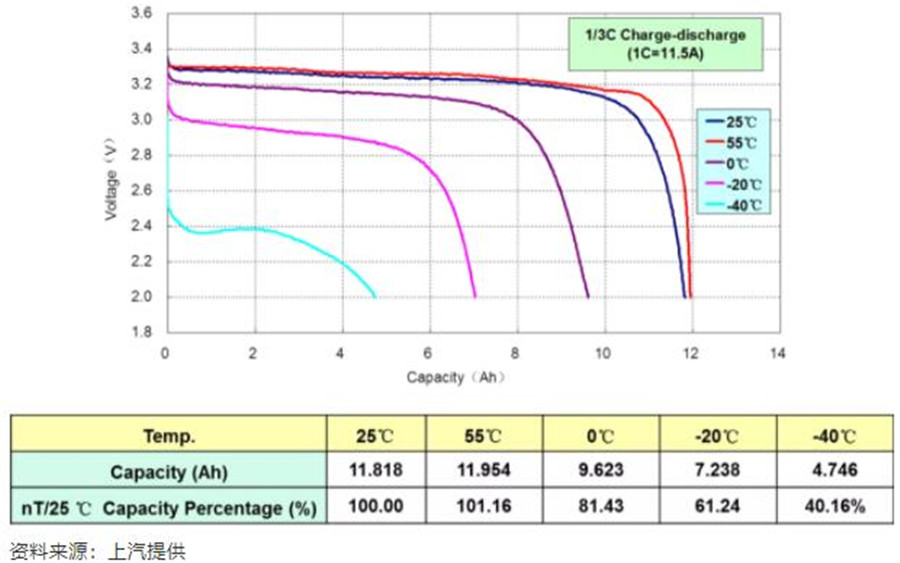 原理上看,低溫使鋰離子電池活性降低。電池在低溫條件下導電率降低,內阻變大,最終導致可用容量降低。有的鋰電池在25℃時可用容量是100%,在-20℃時,可用容量只有61.24%,如果在-40℃,只有40.16%(下圖)。