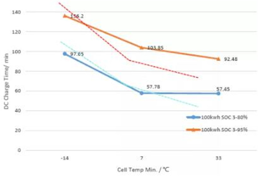 如下圖所示為某款電池在不同溫度下直流快充的時間變化。在-14℃與7℃比充電時間延長超過70%(3%-80%SOC)。