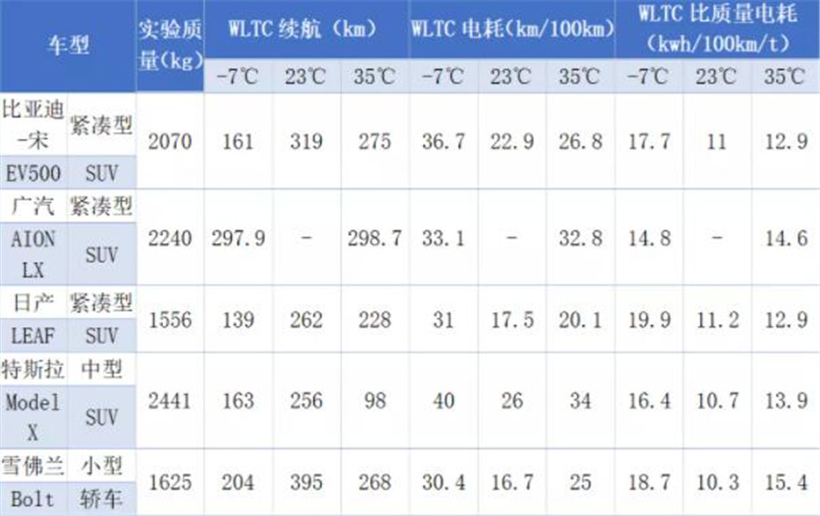 可以看到,在23℃時,所有車輛續航最長,耗電最低。高溫、低溫都會對上述數據產生較大影響。