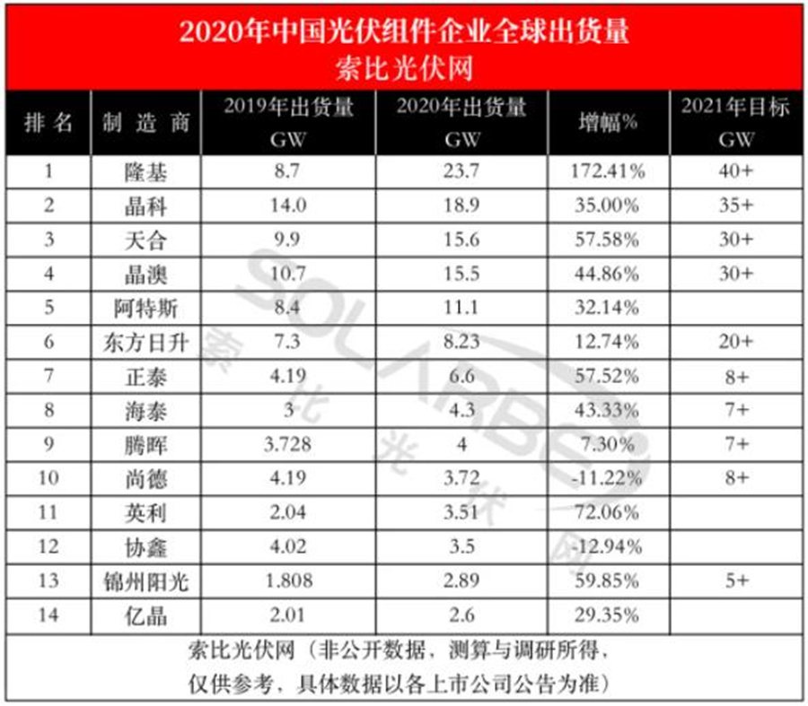 經索比咨詢多次調研走訪,由索比咨詢分析師團隊統計、測算的《2020年中國光伏組件企業(yè)全球出貨量》調研統計結果正式出爐(如下圖所示),以供廣大讀者參考。
