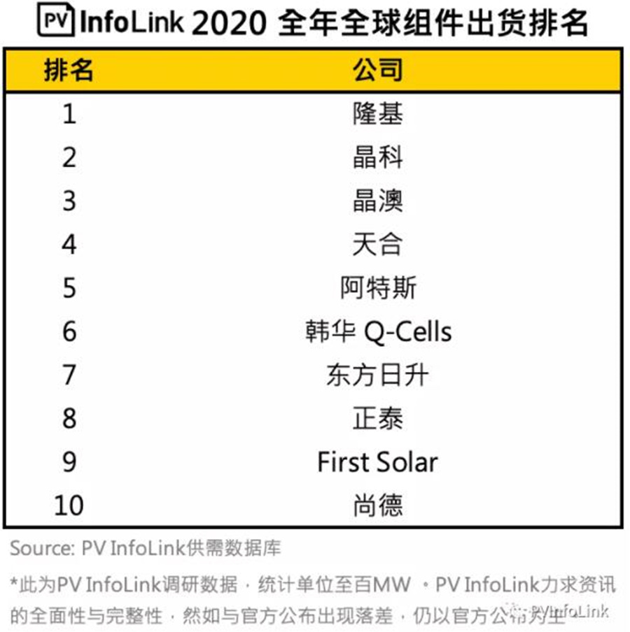 2020全年組件出貨排名出爐!