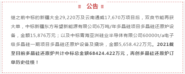 雙良節能的還原爐產品質量、綜合指標行業領先,根據之前公告的與云南通威、新疆大全的供貨合同,雙良節能將充分發揮在光伏多晶硅設備行業長期積累的深厚技術實力和領先的生產能力,為促進全國節能光伏產業和碳中和目標貢獻自己的“智造”力量。