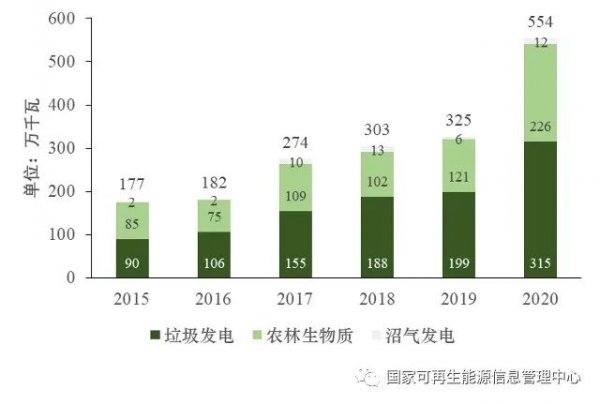 國家可再生能源發(fā)電項(xiàng)目信息管理系統(tǒng)監(jiān)測數(shù)據(jù)顯示,2020年,全國生物質(zhì)發(fā)電新增并網(wǎng)容量553.6萬千瓦,其中,垃圾焚燒發(fā)電315.0萬千瓦,農(nóng)林生物質(zhì)發(fā)電226.2萬千瓦,沼氣發(fā)電12.5萬千瓦。