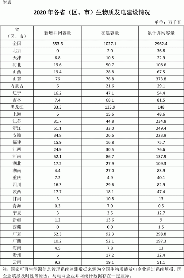 截至2020年底,全國生物質(zhì)發(fā)電累計(jì)并網(wǎng)裝機(jī)2962.4萬千瓦。其中,垃圾焚燒發(fā)電1536.4萬千瓦,農(nóng)林生物質(zhì)發(fā)電1338.8萬千瓦,沼氣發(fā)電87.2萬千瓦。分省區(qū)看,山東、廣東、浙江、江蘇和安徽五省累計(jì)并網(wǎng)裝機(jī)均超過200萬千瓦,占全國累計(jì)并網(wǎng)容量的46.6%。